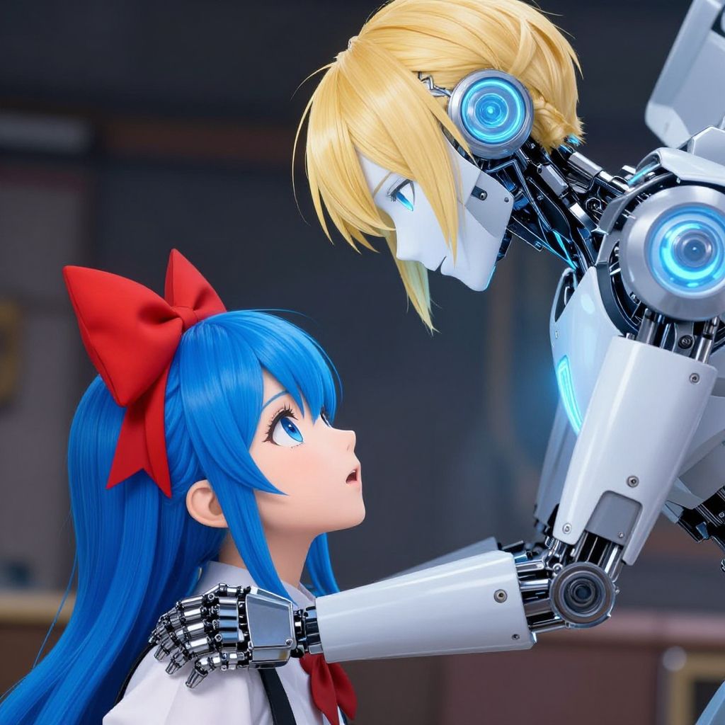 CGI anime-style image: Blue-haired girl with red bow gazes up at a blonde, blue-eyed, robotic boy with glowing eyes, his metal