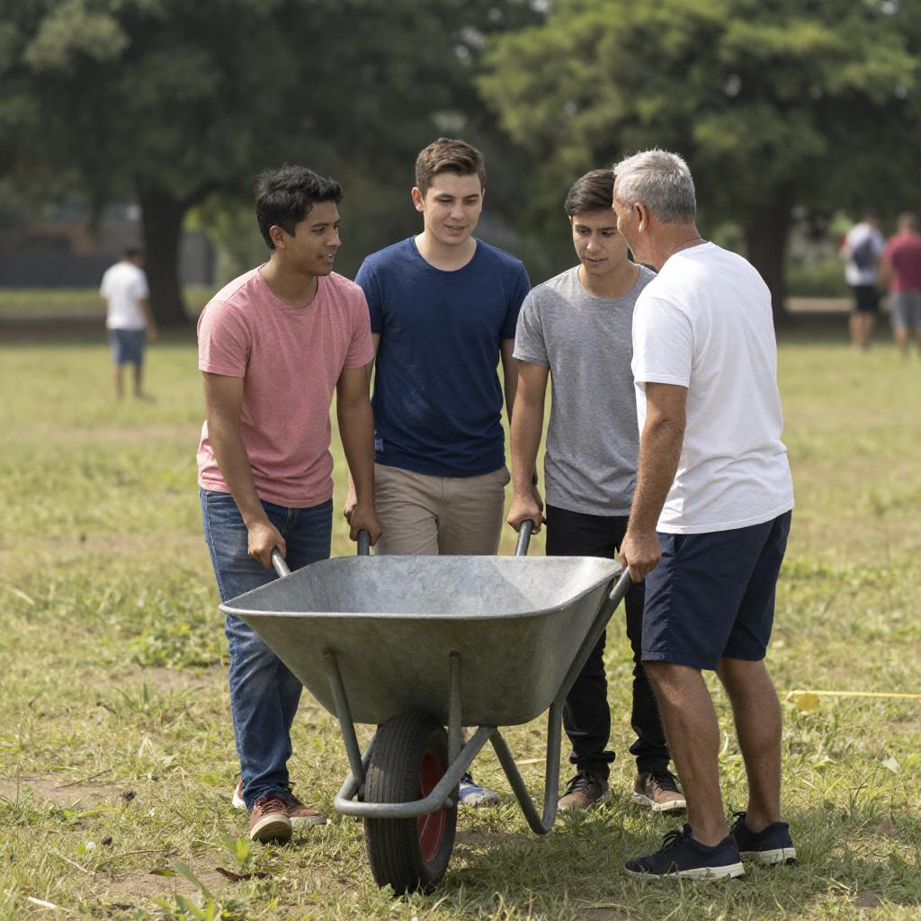 Photograph of two men loading a blue truck with white and blue laundry bags. The man on the left, wearing a yellow tank top and sunglasses, bends over while the man on the right, in a white t-shirt, stands behind the truck's open tailgate. Background includes a brick building and a blue tent. Bright sunlight casts sharp shadows.