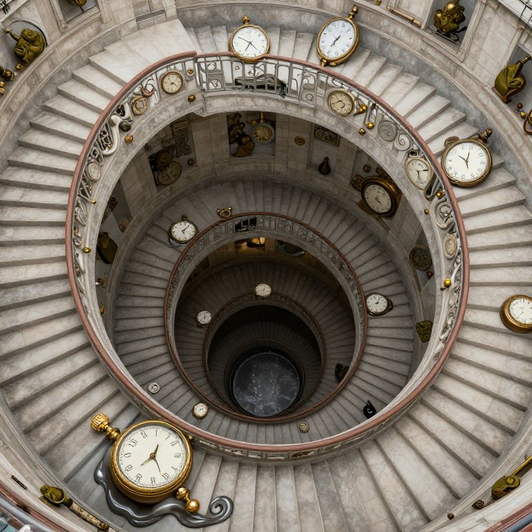 Imagine a whimsical digital art scene featuring an intricate staircase, inspired by surreal landscapes and designed to captivate viewers with its dreamlike quality. The winding staircases loop in impossible geometry, their surfaces adorned with melting timepieces at various stages of transformation, creating a mesmerizing visual texture that invites contemplation on the fluid nature of time. This masterpiece balances precision with chaos, evoking both wonder and intrigue as it beckons the audience to explore its enigmatic depths from an elevated bird's-eye view perspective.