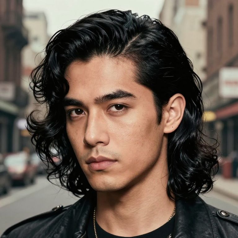 Photograph of a young man with medium-dark skin and black, wavy hair that falls just past his shoulders. He has dark, thick eyebrows, almond-shaped brown eyes, and a neutral expression. He is wearing a black leather jacket over a black shirt. The background is a blurred urban street scene with red-brick buildings and a few indistinct people and vehicles. The lighting is natural, highlighting his face and hair. The image has a slightly enhanced, almost digital art-like quality, giving it a polished, semi-realistic appearance.