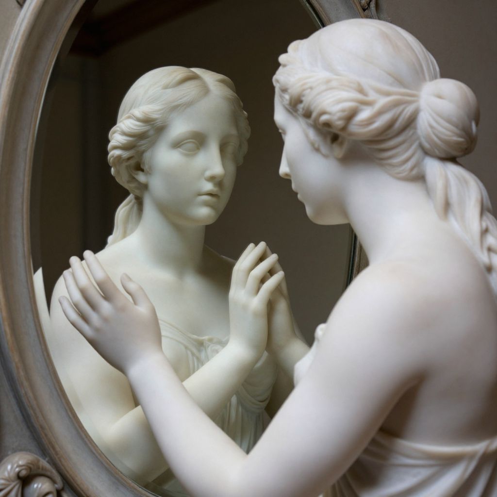 Photograph of a white marble statue of a woman with soft curls, gazing into an oval mirror, hands gently touching her chest. Reflection shows her