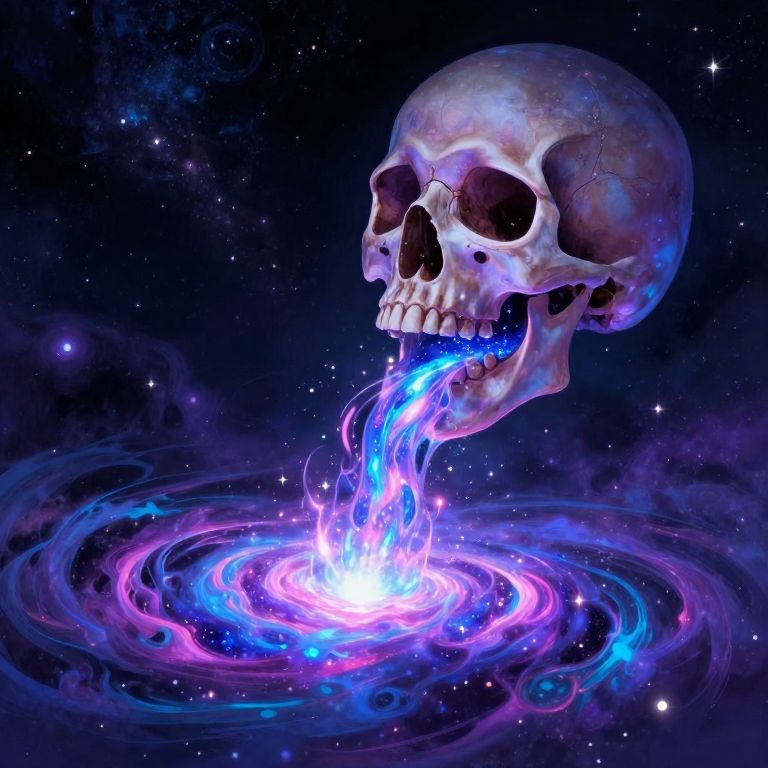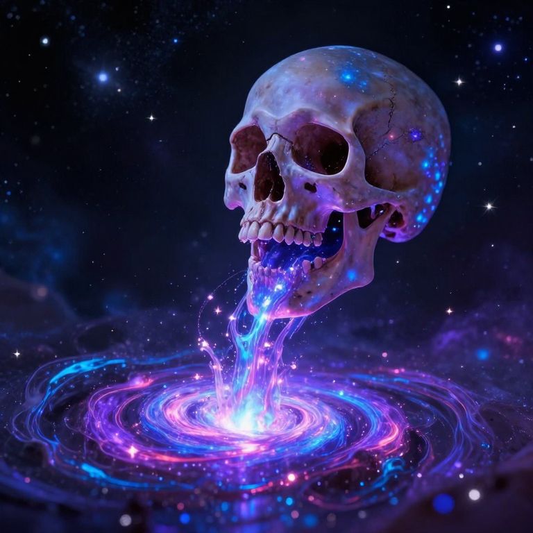 A digital CGI image of a glowing, cosmic skull with a cracked surface, floating in space. The skull, illuminated with vibrant purples, blues, and pinks, emits a bright, luminous stream of water-like energy that forms a colorful, swirling vortex at its base. The background is a deep, star-filled blackness, enhancing the ethereal, otherworldly atmosphere. The skull's hollow eye sockets and teeth are starkly detailed, contrasting with the glowing, fluid-like energy. The image evokes a sense of mysticism and the supernatural.