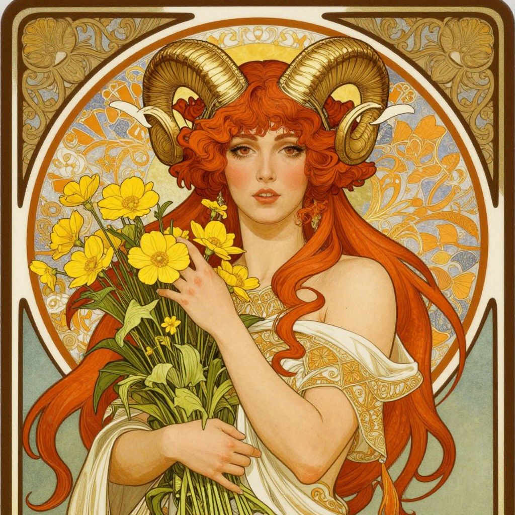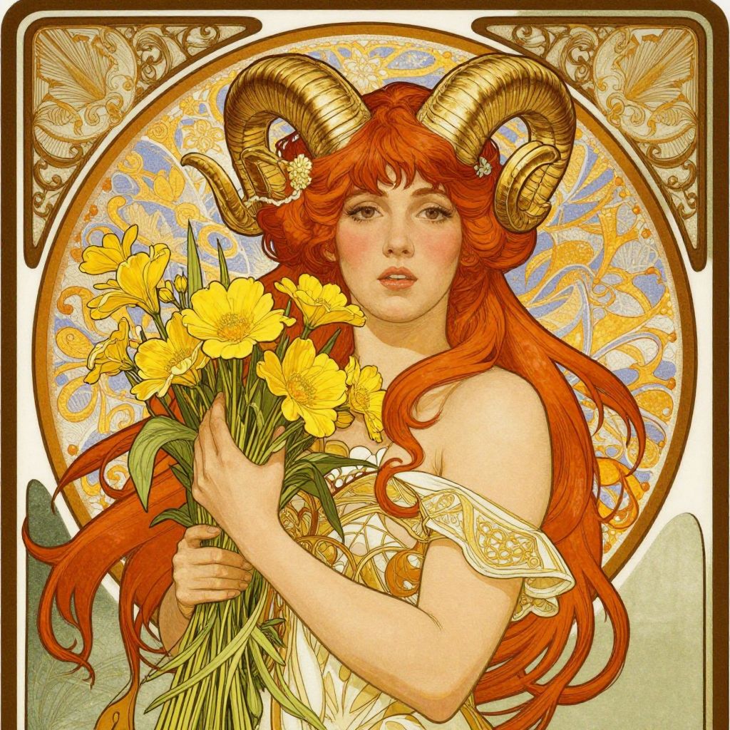 A vibrant Art Nouveau-style illustration featuring a woman with fiery red hair adorned with golden ram horns, symbolizing the Aries zodiac sign, elegantly holding a bouquet of yellow flowers against a richly detailed ornate frame, evoking a timeless and mystical aesthetic.