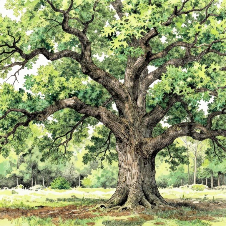 Digital drawing of a large, sprawling oak tree with thick, twisted branches and vibrant green leaves, set against a bright, sunlit forest background.