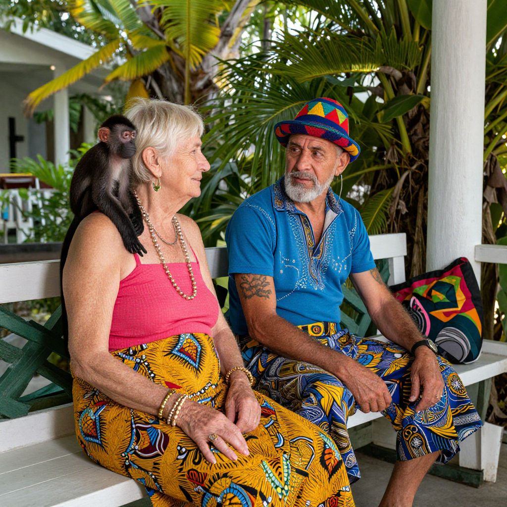 An elderly couple sits on a porch, the man with a monkey on his shoulder, both dressed in vibrant, patterned clothing and accessories, surrounded by tropical plants and a tattooed man with a colorful hat.