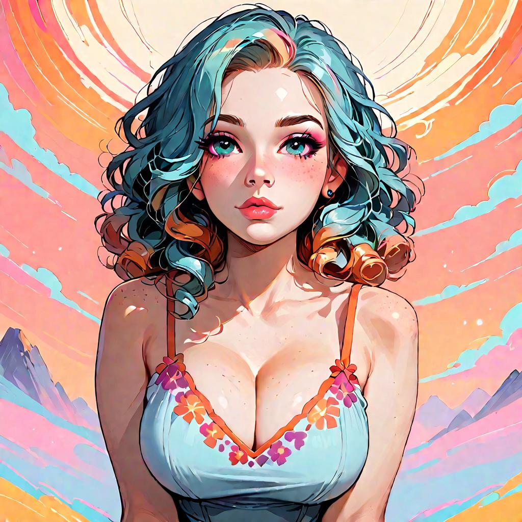 Illustration of a blonde woman with long wavy hair wearing a blue floral spaghetti strap sundress standing with hands holding the skirt in a colorful pastel sky setting. The image features bright backlit sunlight enhancing the silhouette, vibrant pastel pink and orange cloud shapes, and a serene outdoor environment evoking bohemian fashion style.
