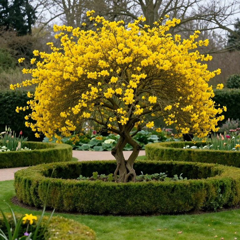 Photograph of a vibrant garden scene featuring a central tree with bright yellow flowers. The tree's trunk is twisted and gnarled, surrounded by a circular, well-trimmed, green hedge. In the background, there are blurred flowerbeds with red and white tulips, and tall trees with bare branches. The grass is lush and green, adding to the garden's lively appearance. The bright yellow flowers of the tree contrast sharply with the greenery and provide a focal point in the composition. The overall setting is serene and well-maintained.