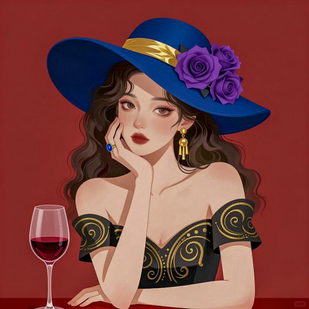Digital illustration of a woman with light skin and red lipstick. She wears a blue satin sleeveless top, large blue bow-tied hat, blue cat-eye glasses, and blue teardrop earrings. Her dark brown hair is in a tight bun. Background has vertical blue and black stripes. She has a confident expression. She is centered in the image.