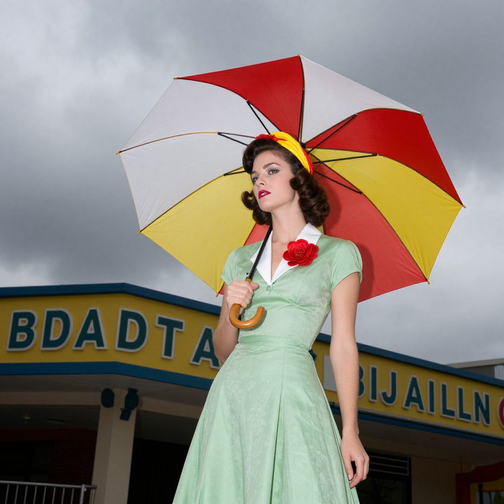 In the image, a woman stands under a large, colorful umbrella, which is predominantly white with red and yellow sections. She is wearing a light green dress with a white collar and a red flower pinned to her chest. Her hair is styled in a vintage, voluminous manner, and she is wearing a headpiece that matches the umbrella's colors. The background features a building with a colorful facade, displaying the text \"BDADTAI\" and \"BIJALLN\" in bold letters. The sky is overcast with dark clouds, suggesting a gloomy atmosphere. The scene is reminiscent of a vintage, stylized fashion shoot, evoking the aesthetic of Guy Bourdin's work. The overall composition is dynamic, with the woman and her umbrella as the central focus, set against the contrasting backdrop of the building and the sky.