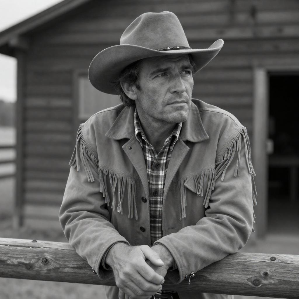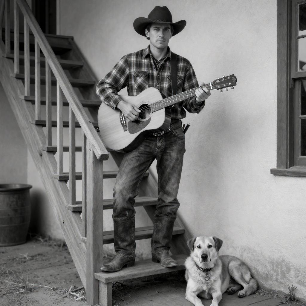 Black-and-white photograph of a rugged cowboy in a plaid shirt, jeans, and a hat, standing on a wooden staircase. He holds a guitar and a pistol, with a dog lying at his feet. The cowboy's serious expression contrasts with the dog's relaxed posture. The staircase and wall create a rustic, western setting.