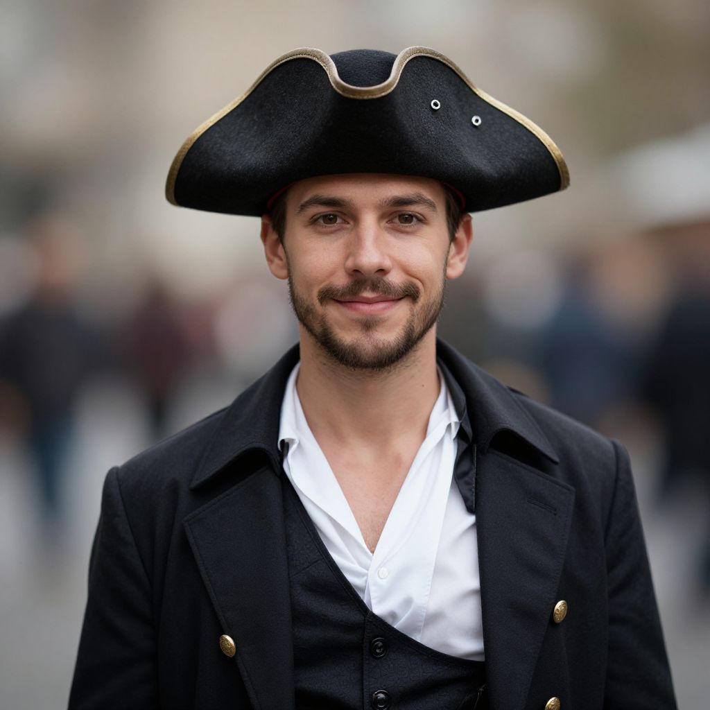 Adult mischief maker costume, male focus, 1boy, hat, looking at viewer, bicorne, facial hair, solo focus, mustache, realistic, blurry, ascot, blurry background, pirate hat, long sleeves, coat, smile, epaulettes, solo
