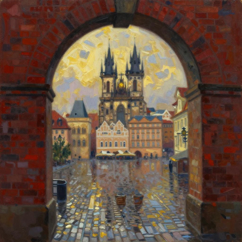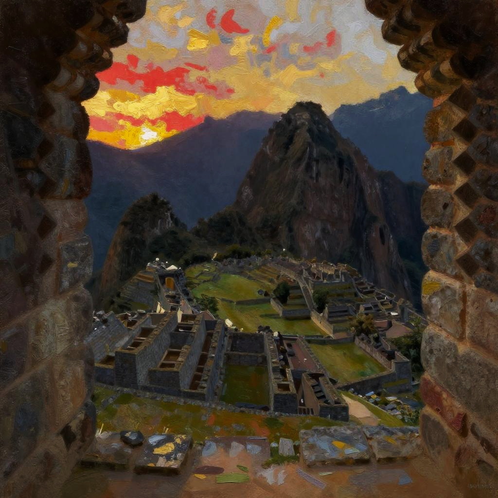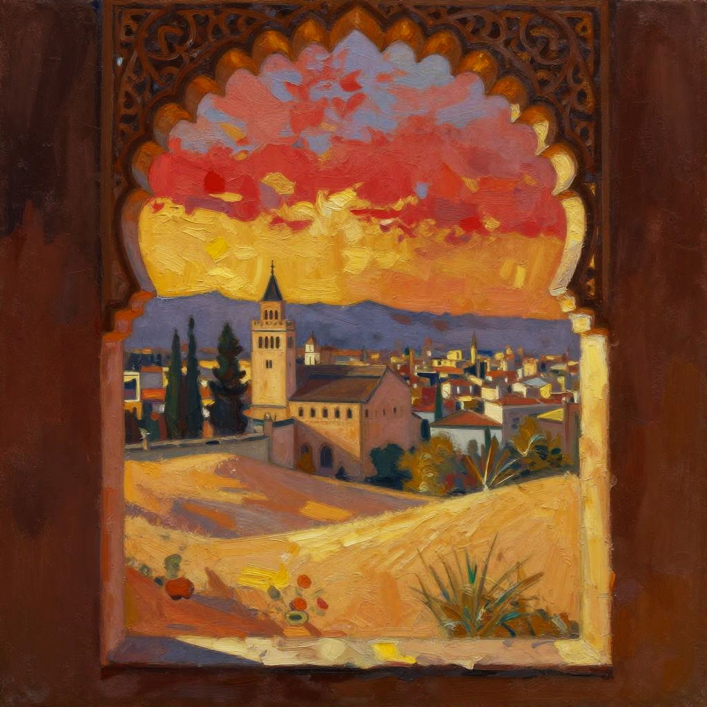 A stylized, rough impressionistic painting of a golden wheat harvest viewed through a rustic barn window, looking out over Tuscany. The sky is painted in scarlet and gold, with hues blending like a faded rose, capturing the delicate, fading light of evening. The scene is rendered with a large palette-knife technique, giving the piece a textured, expressive quality. The composition feels nostalgic and atmospheric, with broad, layered strokes that evoke warmth and beauty against the cityscape backdrop.