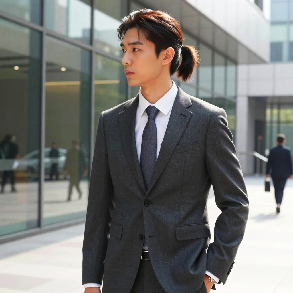Classic Ponytail hairstyle on male executive, wearing designer business suit, in glass office lobby, captured in fashion editorial style with bright polished highlights.