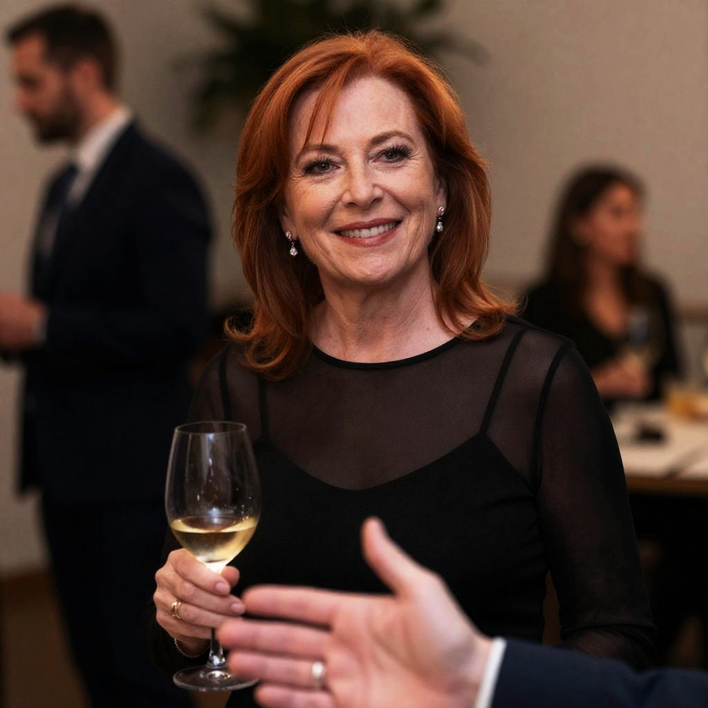 Photograph of a middle-aged woman with red hair, wearing a black, sheer, long-sleeve blouse and diamond earrings, smiling while holding a wine glass in her right hand. She is interacting with a person whose hand is visible in the foreground. Background includes blurred figures and a dimly lit room.