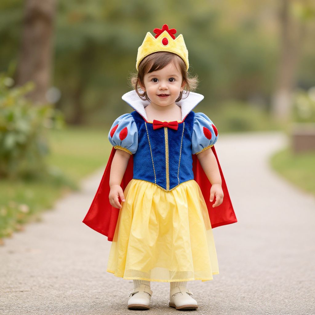 Photograph of a cute, young girl in a Snow White costume with yellow dress, blue bodice, red cape, and gold crown, standing on