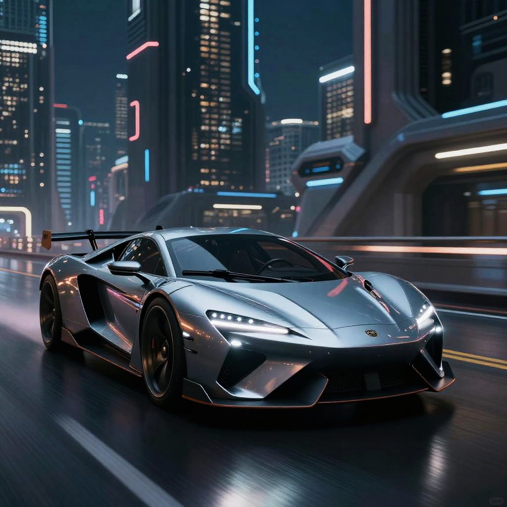 Night photo, cinematic photo of black Ferrari, Miami, rainy weather, perfect lighting, vibrant, high detailed, epic