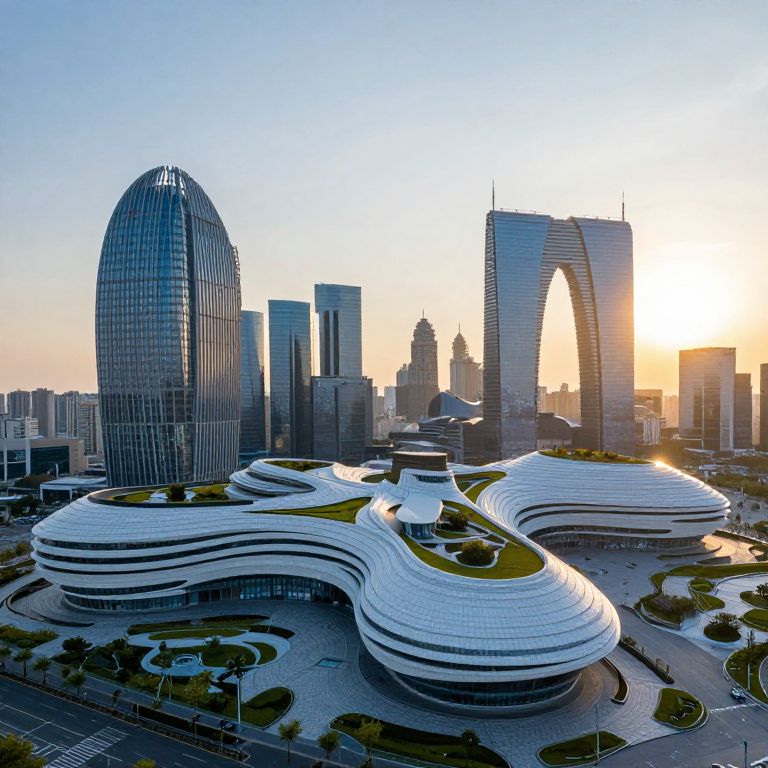 Polygonale architectural design featuring futuristic buildings made of interconnected polygons, sharp edges, and reflective glass surfaces under a vibrant sunset sky, digital art style with neon highlights and intricate geometric patterns.