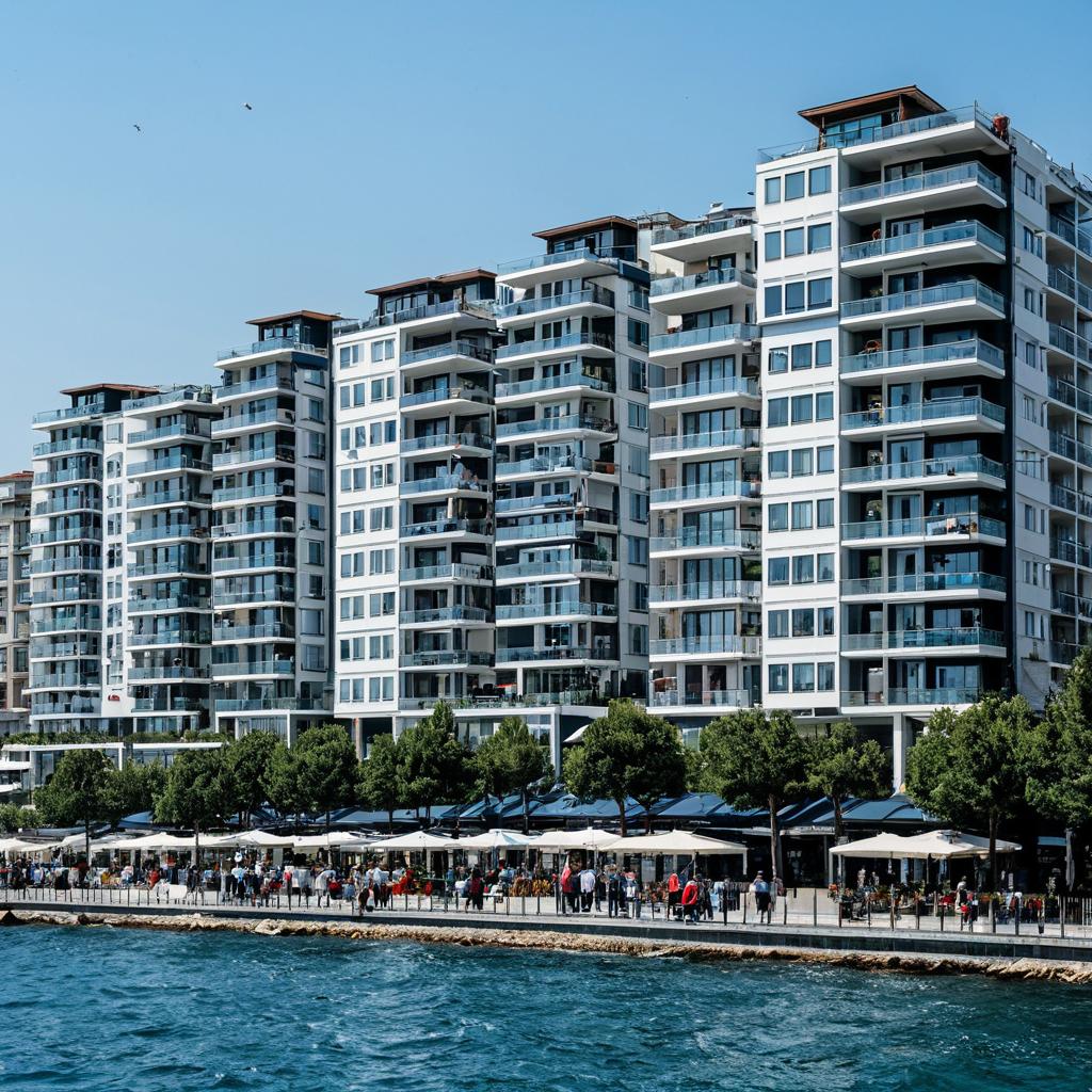 Peter Pan ultra realistic image of modern residential buildings on seaside of istanbul, total of 8 buildings with each having 5 storeys, maximum height of the buildings is 5 storeys, along the sea side of the compound there is a large shopping deck with green trees and various shops and cafes, people are walking on the shopping deck, day time photo with vivid blue sea and blue sky, white colors and used in buildings, use vivid colors and marine theme, 8k,