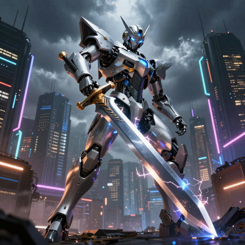 Digital artwork of a towering, futuristic mecha robot with a sleek, metallic silver and blue armor, standing dominantly in a neon-lit, cyberpunk cityscape. The mecha wields a massive, glowing sword emitting bright, electric blue and white lightning-like energy. Its head features sharp, angular design with glowing blue eyes. The background showcases tall skyscrapers with vibrant, multi-colored neon lights. Dark, stormy clouds loom overhead, adding dramatic contrast. The mecha's joints and armor plates are detailed with intricate lines and highlights, emphasizing its advanced, robotic design. The ground beneath the mecha is dark and shadowy, enhancing the mecha's illuminated presence.