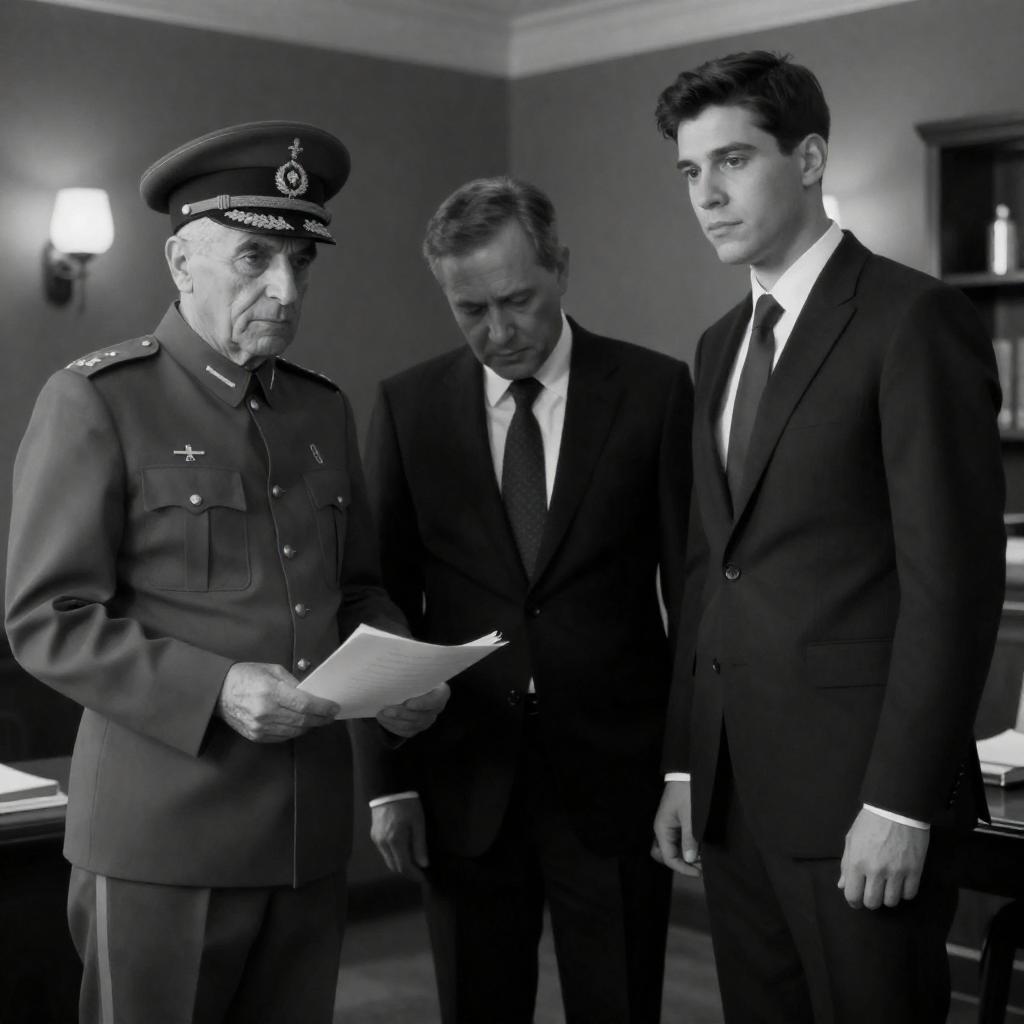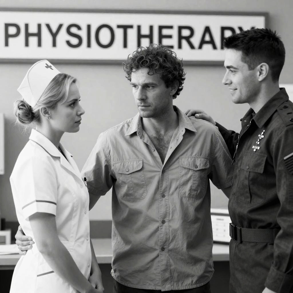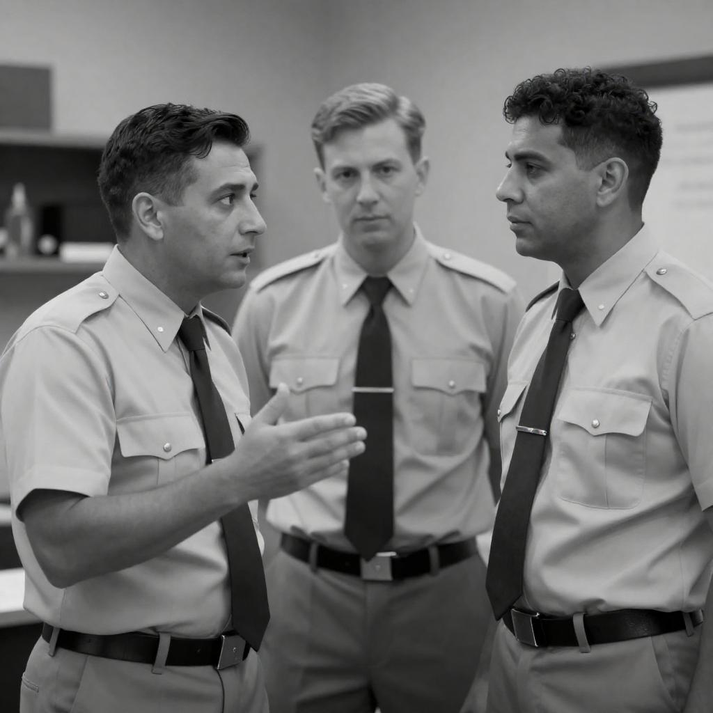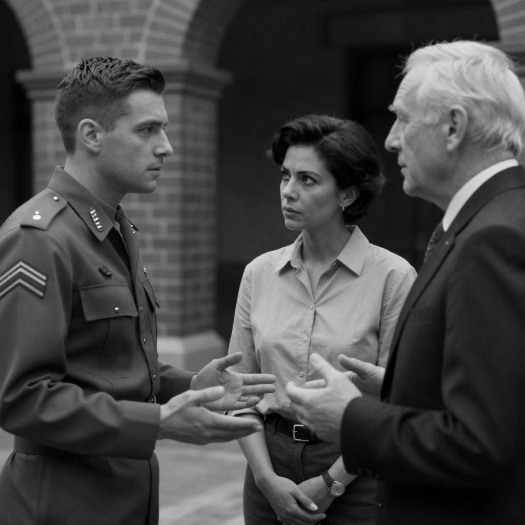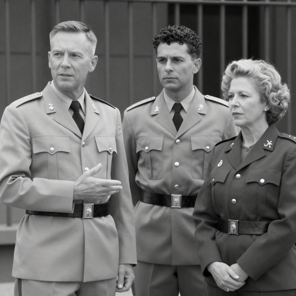 Black-and-white photograph of three people. Three men and women in military-style uniforms. Man on left gestures with right hand, facing middle man. Middle man with dark curly hair, slight smile, looking left. Woman on right with blonde hair, serious expression, holding a hat. Background with vertical metal bars. All uniforms have buttons and epaulettes.