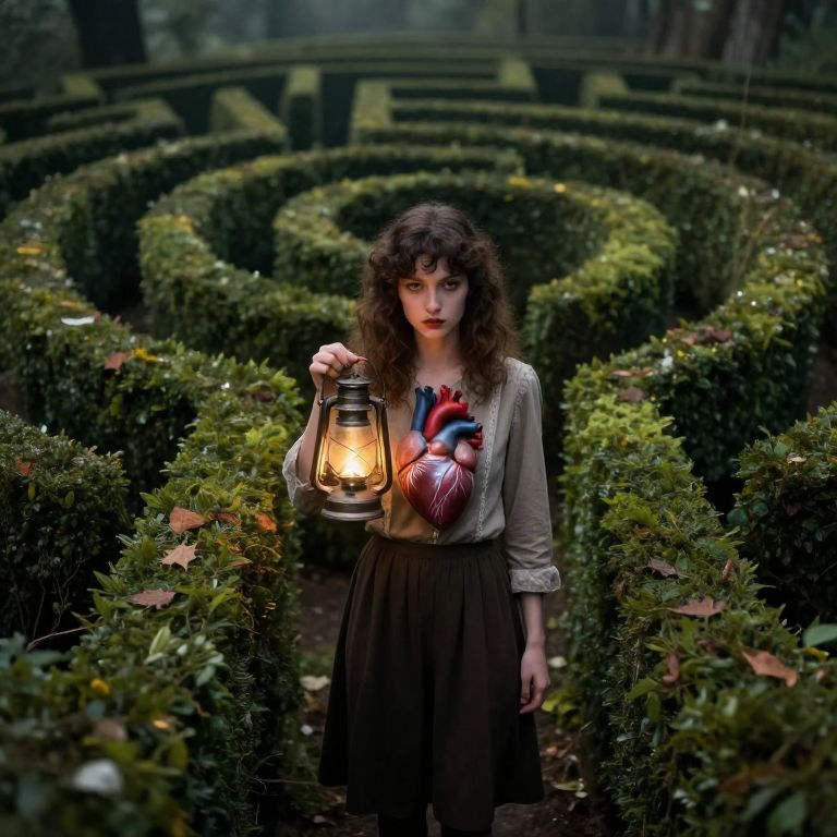 A young woman with deep brown eyes and curly black hair stands at the center of a vast, moss-covered maze-like forest path, where towering stone walls with intricate carvings form twisting corridors under a soft golden dawn light, with fog drifting between the maze-like passages.