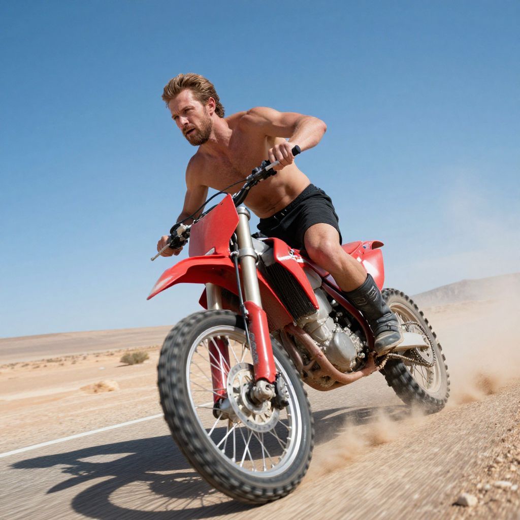 A muscular, shirtless man with light brown hair and a beard is riding a red motorcycle on a desert road. He's hunched over, gripping the handlebars tightly, with dust flying up behind him. He's wearing black shorts and boots, and the bright blue sky and arid landscape are in the background. The image is a dynamic, action-packed photograph.