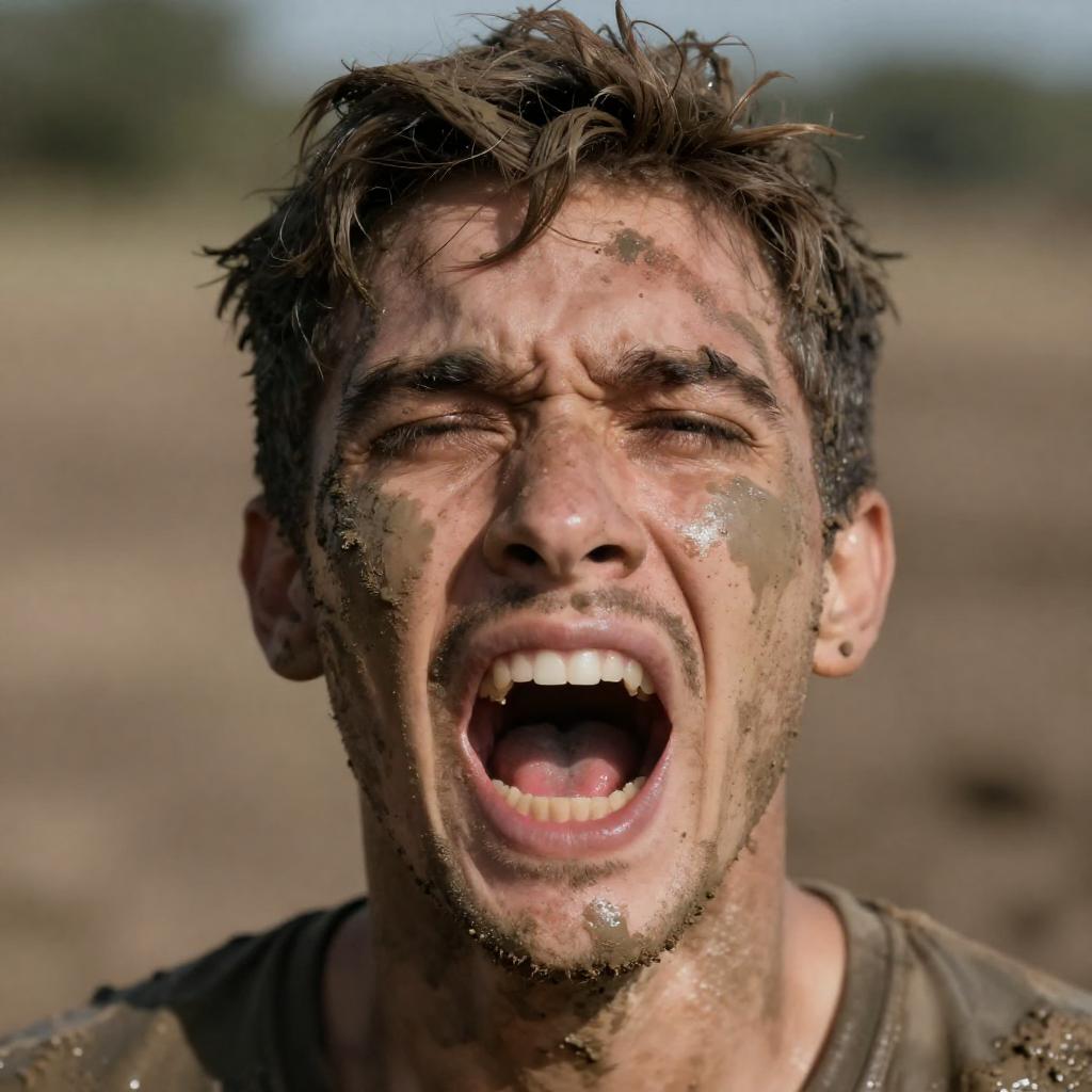 Close-up photograph of a muddy, distressed man's face with intense, open-mouthed scream. Mud covers his face and hair. Background is blurry with earthy tones. Man's skin is pale. Lighting highlights his face. One person.