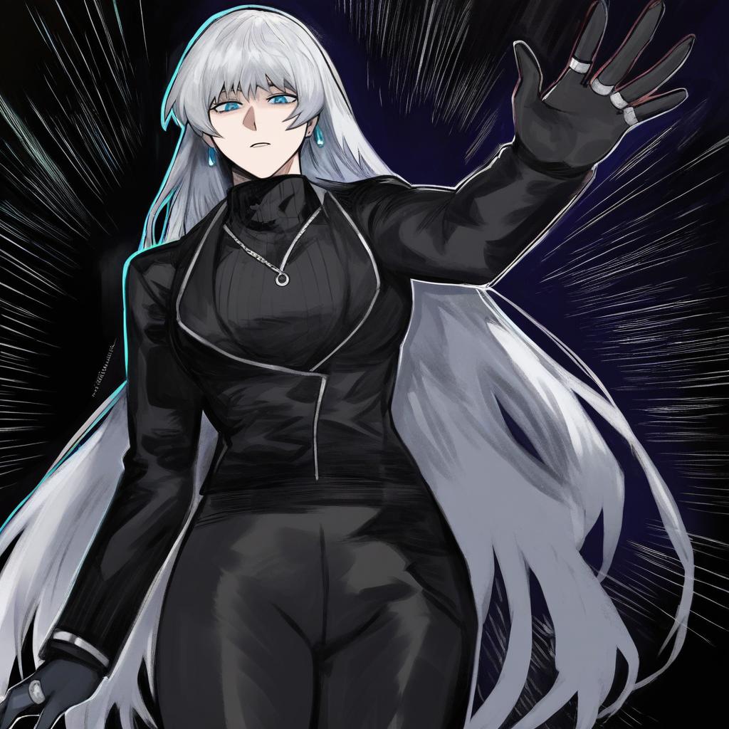 Angelica (project moon), project moon, 1girl, blue eyes, white hair, very long hair, black jacket, black sweater, black gloves, turtleneck sweater, ribbed sweater, black pants, long sleeves, ring necklace, ring, by artist yourfreakyneighbourh, leet
