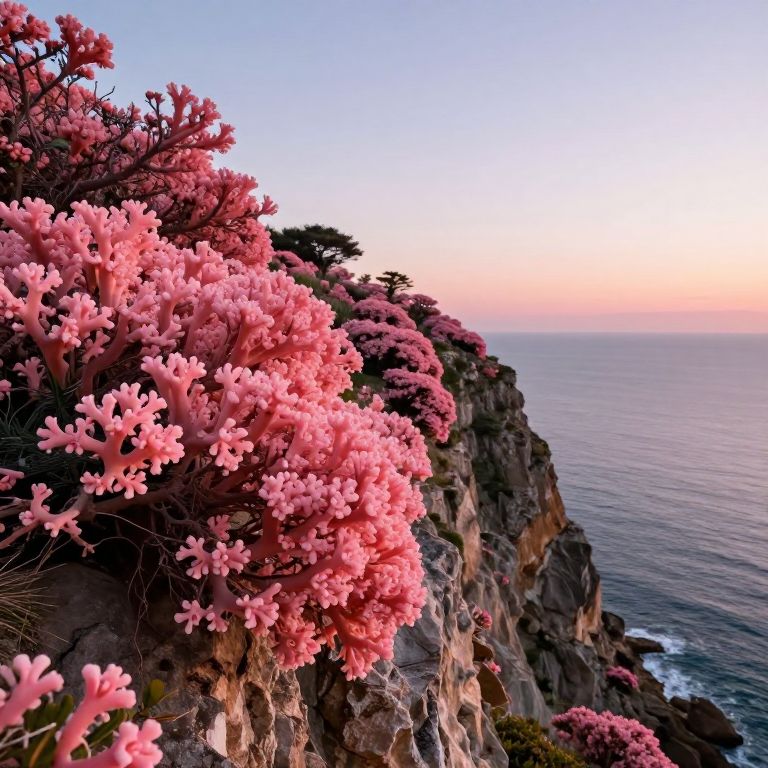 Enormous, coral-like pink blooms cascade along a rugged cliffside at dusk, defying gravity as they stretch toward the horizon, their ethereal forms blending seamlessly with the tranquil sea below.