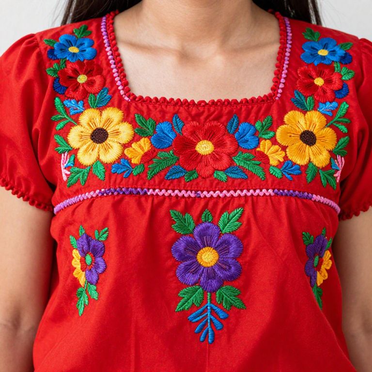 A vibrant tomato red Mexican peasant blouse featuring intricate hand-embroidered floral patterns in vivid blues, yellows, greens, and purples, showcasing traditional folk artistry with a festive \"Fiesta\" aesthetic.