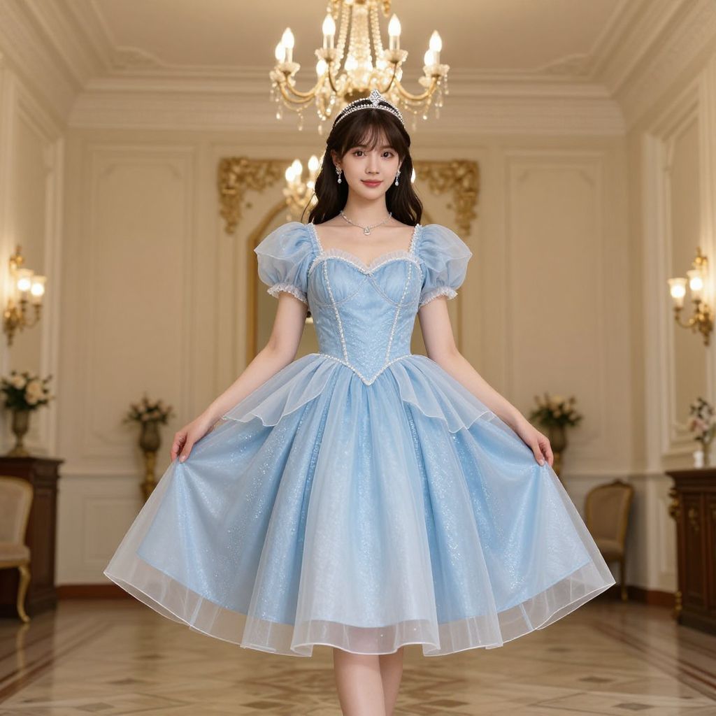 Princesscore Dress, a woman in a blue dress standing in a room with chandeliers