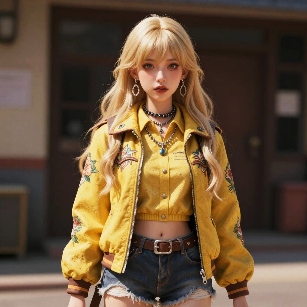 Photorealistic digital art: Blonde woman with long wavy hair, yellow embroidered jacket, denim shorts, choker, necklace, standing outdoors, daytime