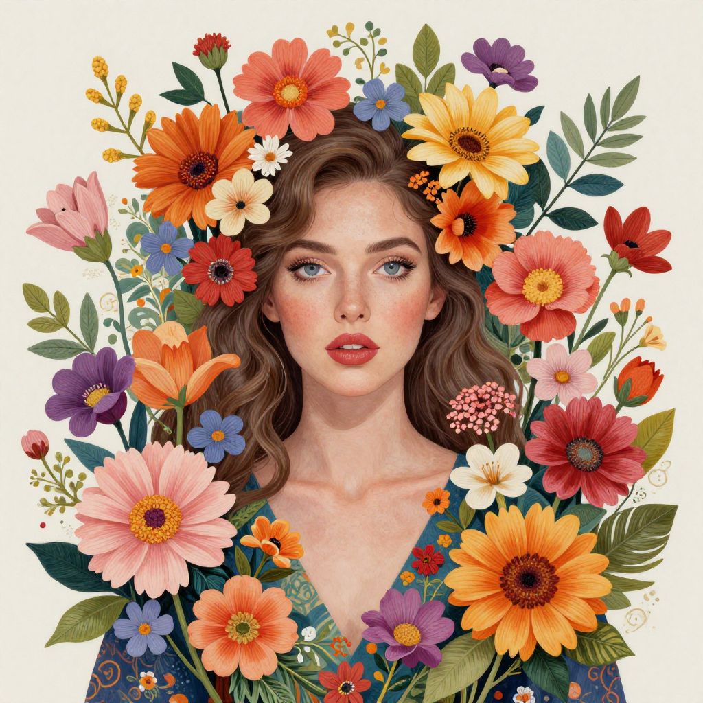 This vibrant artwork features a woman surrounded by a lush array of colorful flowers, showcasing a harmonious blend of nature and beauty. The intricate details and vivid colors create a whimsical and enchanting atmosphere, reflecting an artistic style that merges realism with imaginative floral elements.