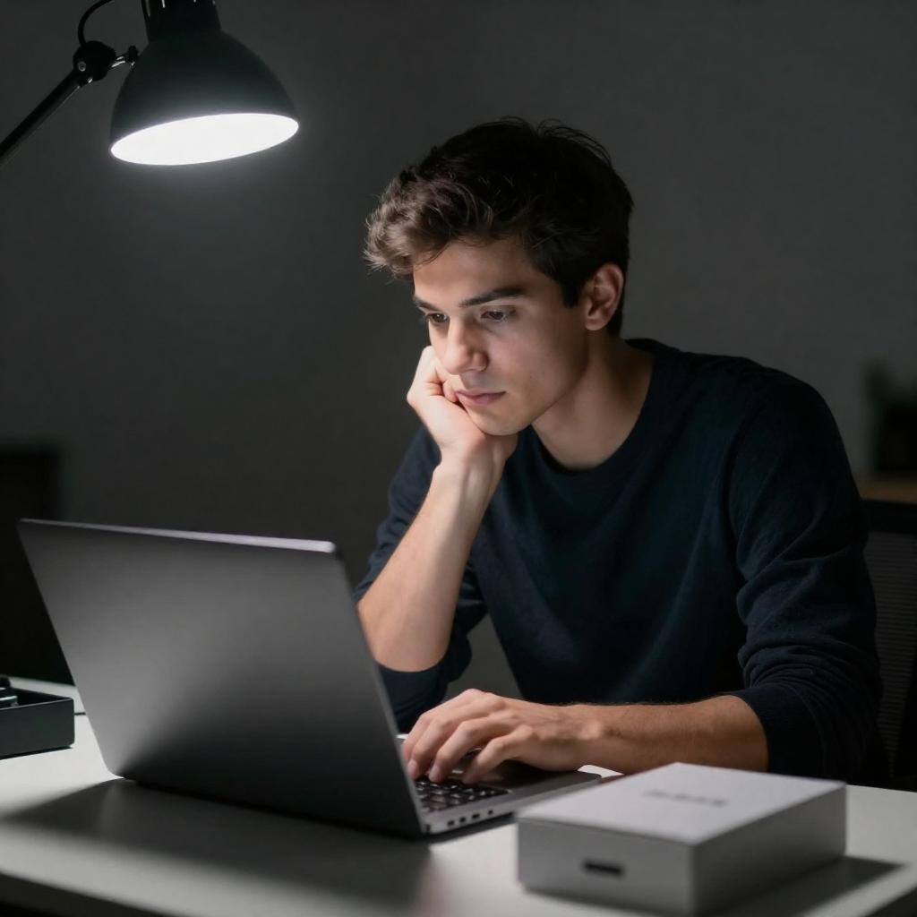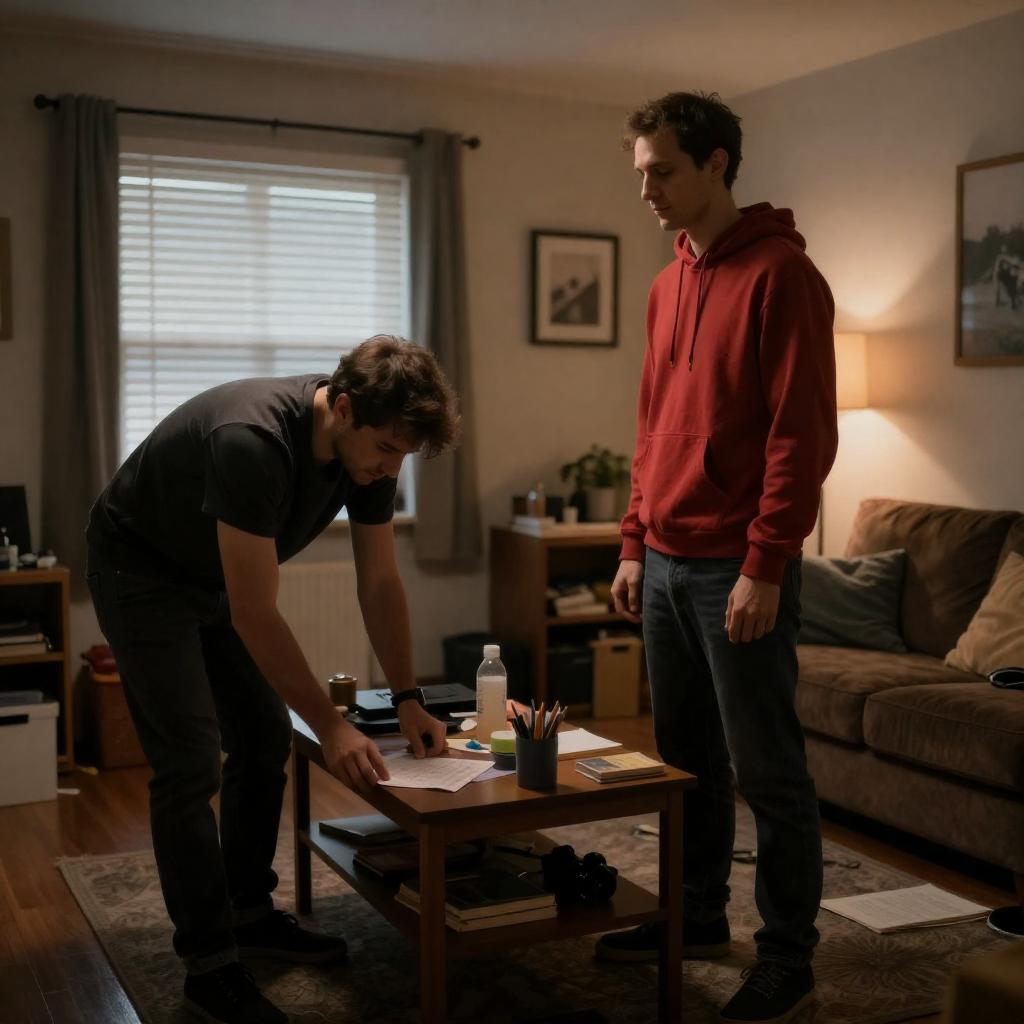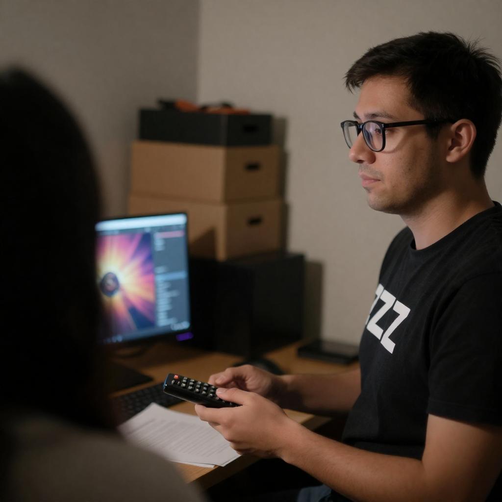 Photograph of a man with glasses, short dark hair, and a black t-shirt with a white "ZZ" , holding a remote control, facing a blurred person in a dimly lit room. Background includes a cluttered desk with papers, a computer screen displaying a colorful image, and a stack of boxes.
