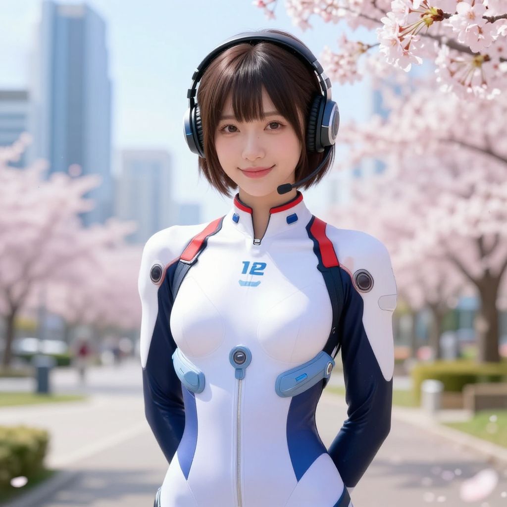 Masterpiece, best quality, 1girl, souryuuasukalangley, plugsuit 02, interface headset, looking at viewer, light smile, upper body, science fiction city, park, cherry blossoms, arms behind back