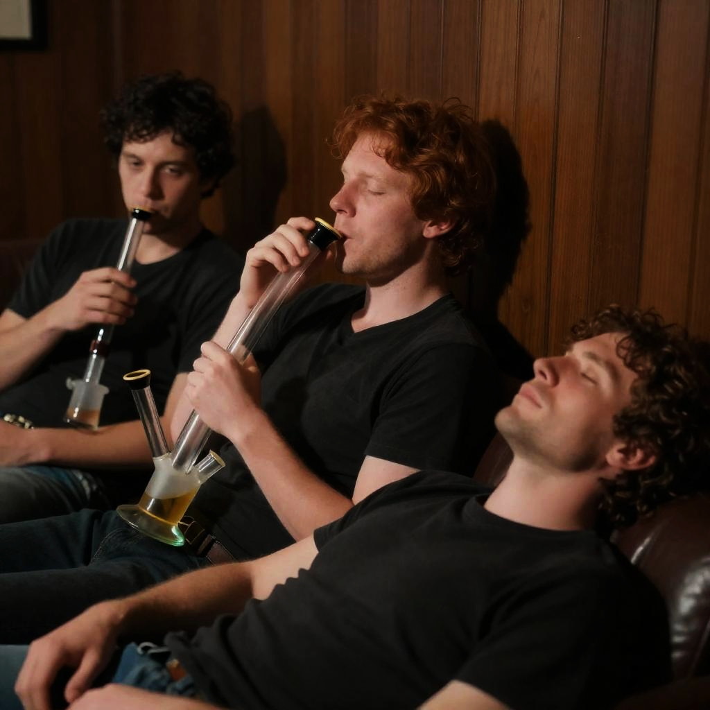 Three nude men in a dimly lit room. One with dark hair holds a glass bong to the red-haired man's mouth, who is inhaling. The curly-haired man on the right lies back, eyes half-closed, looking relaxed. Wood-paneled wall in the background. Red-haired man's eyes closed, concentrating on bong. Dark-haired man's focused expression.