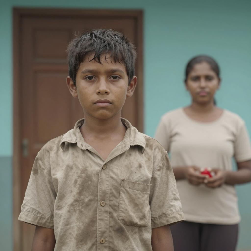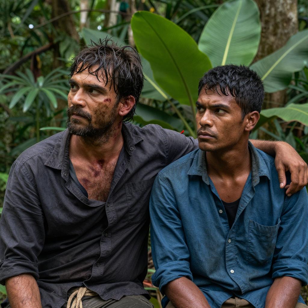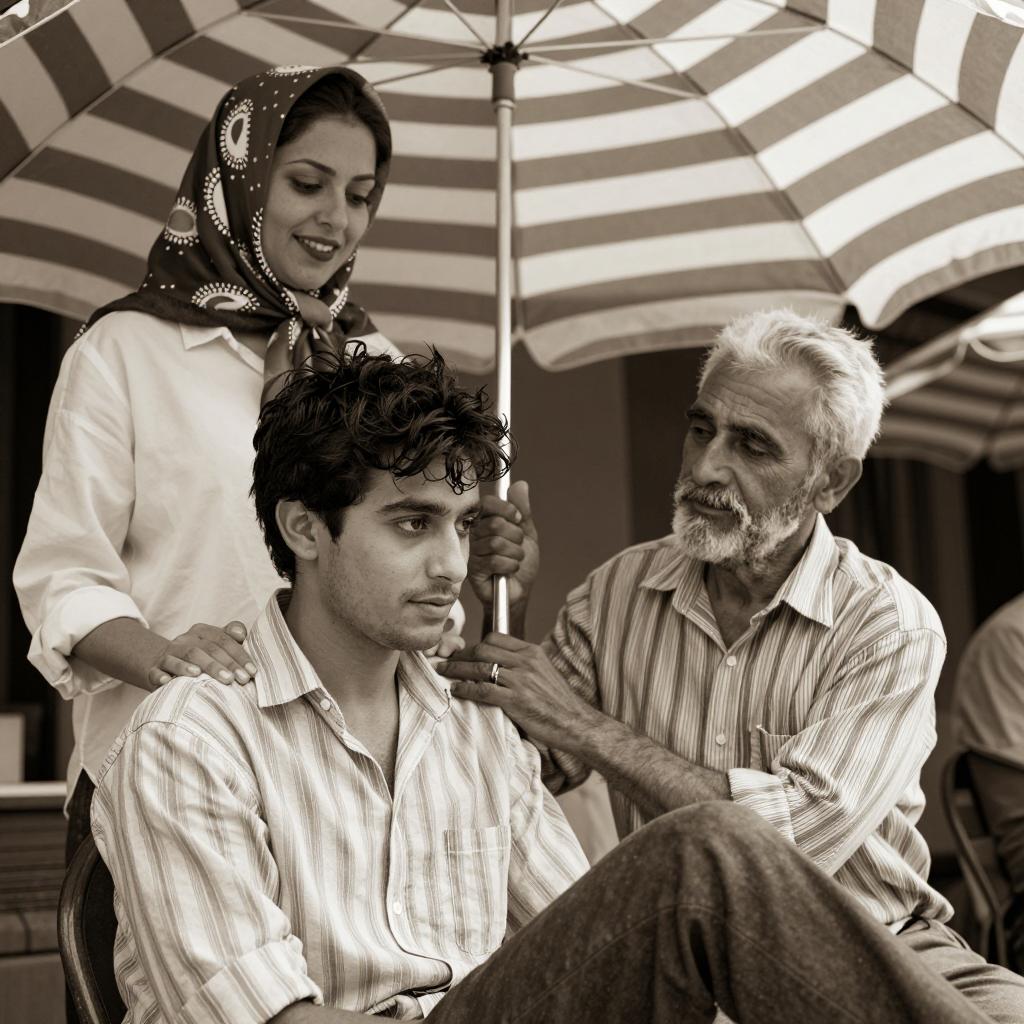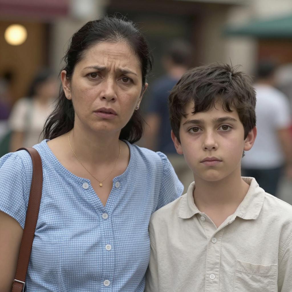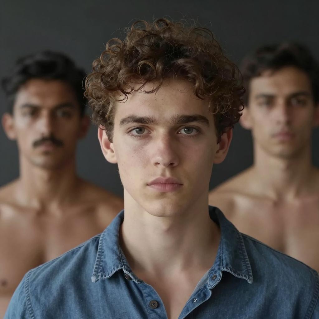 Portrait of a man with curly black hair, green eyes, wearing a blue plaid shirt, pointing forward with his right hand. Beside him, a boy with brown hair, wearing a pink polo shirt and red cap with blue buttons, sitting against a plain yellow wall background. The man has an intense expression, while the boy's expression is neutral. Both are looking directly at the camera.