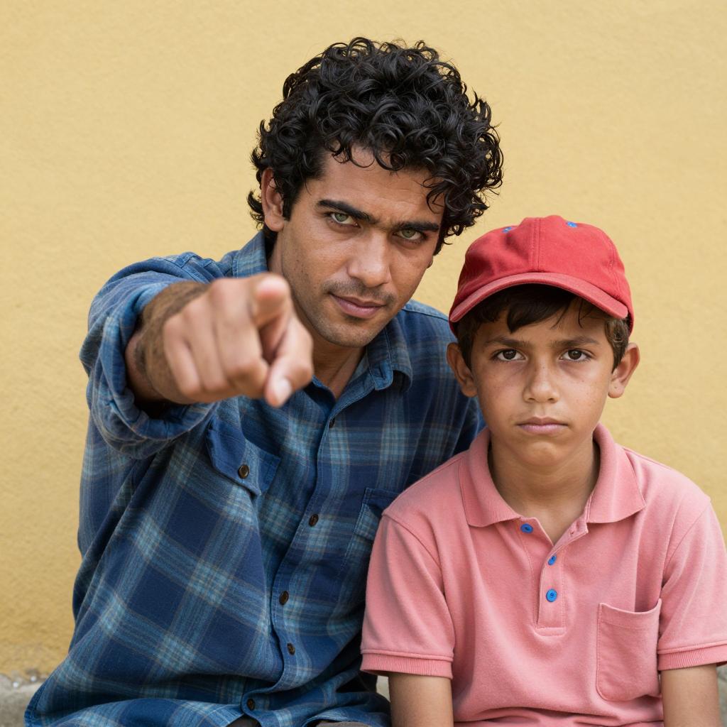 Man with curly black hair, green eyes, blue plaid shirt, pointing forward with right hand. Boy with brown hair, pink shirt, red cap with blue buttons, sitting beside him. Background: yellow, ured surface. Man's intense expression, boy's neutral expression. Both looking towards camera. Two people.