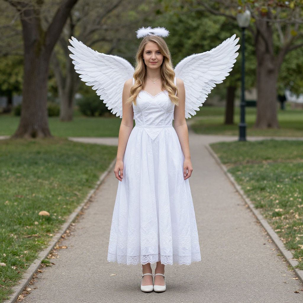 "White Angel Dress Costume, angel in white dress standing on sidewalk in park"