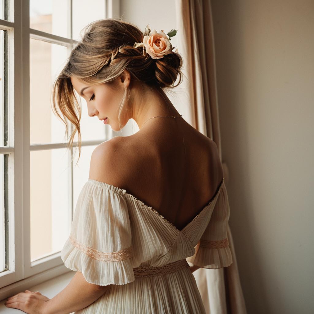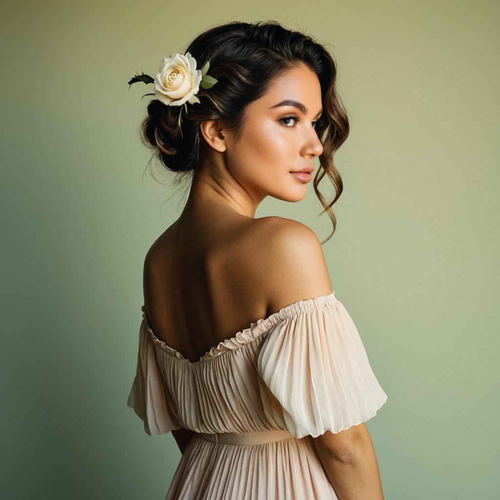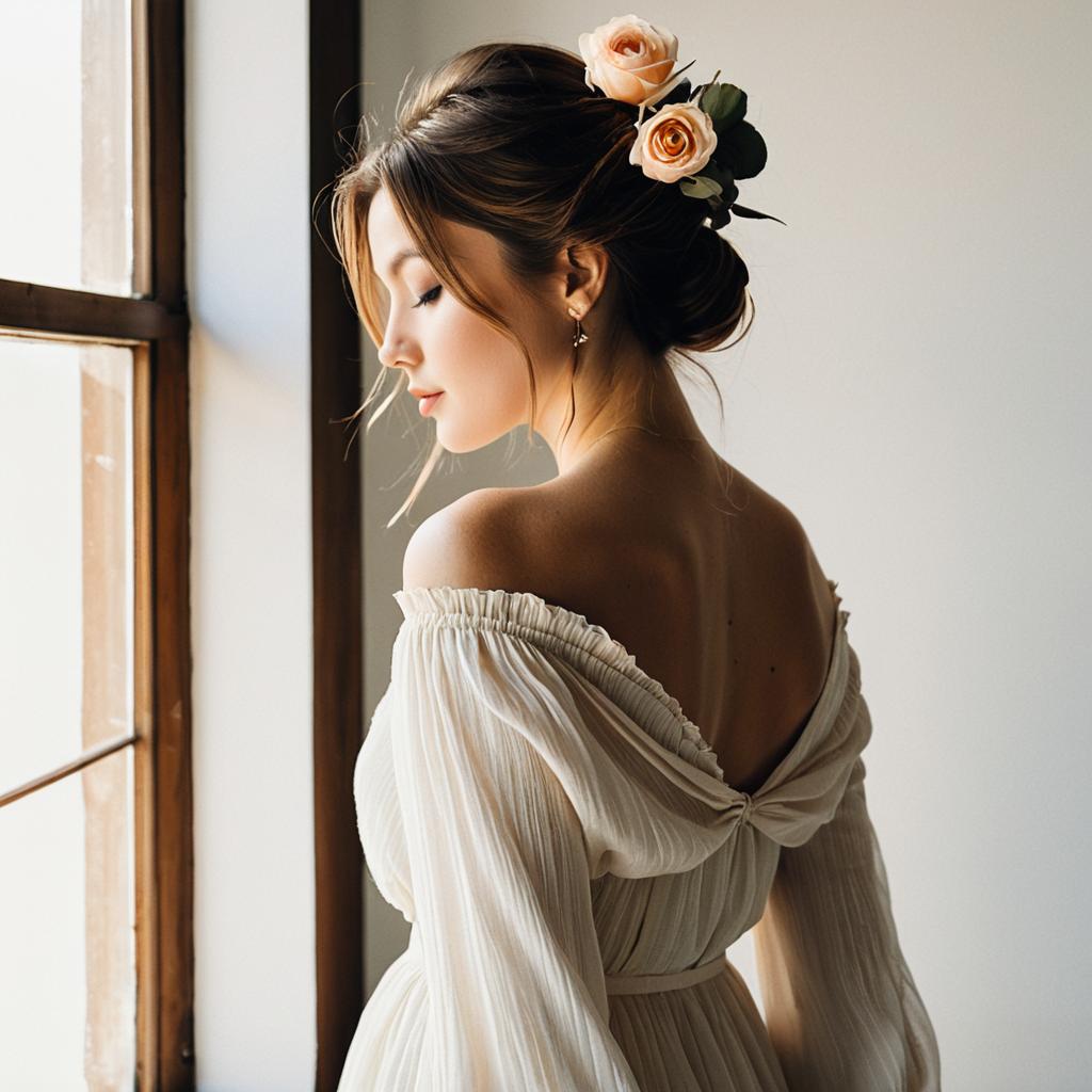 Elegant Woman in Off-Shoulder Bohemian Dress with Rose in Hair