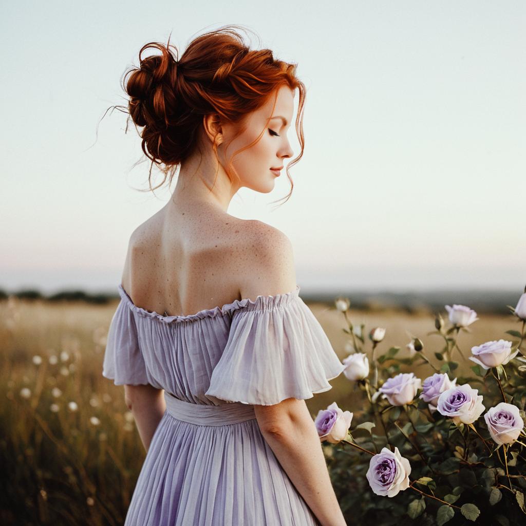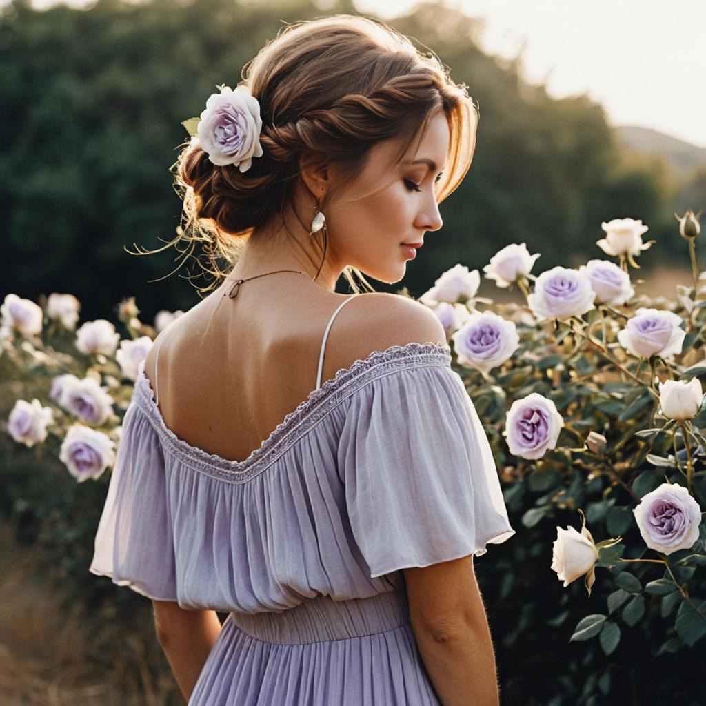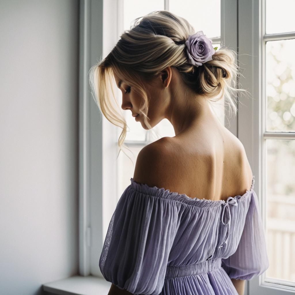 Gentle pretty woman wearing off-the-shoulder backless bohemian chiffon dress with delicate textured pleats in cool porcelain white with soft lavender roses woven into her loosely pinned hair on light-skinned brunette woman with loose low bun posed in gentle profile with head bowed and bare shoulder exposed in soft pastel gradient background, warm golden light for a sun-kissed look, fine art fashion photography, high resolution, ultra-detailed