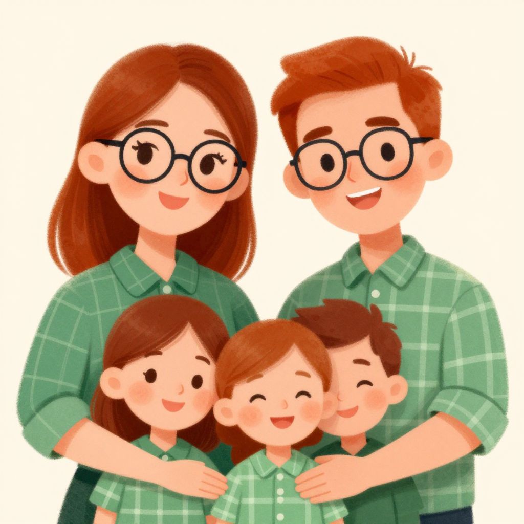This is a digital illustration in a cute, cartoon style depicting a happy family of five. The parents, a woman with brown hair and black-rimmed glasses, and a man with red hair and glasses, wear matching green plaid shirts. They stand behind two young girls and one young boy, all with brown hair and also in green plaid shirts. The children are smiling and hugging each other, with the father's hands on the boy's shoulders and the mother's hands on the other girl's shoulders. The background is white, emphasizing the family's cheerful expressions and warm, close-knit relationship.