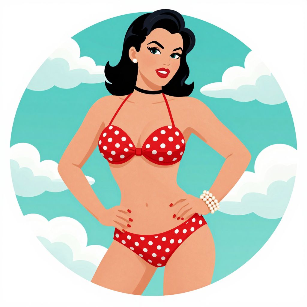Vibrant pin-up illustration featuring a woman in a red polka-dot bikini set, accessorized with a black choker and pearl bracelet, striking a confident pose against a circular backdrop of a teal sky dotted with fluffy white clouds.