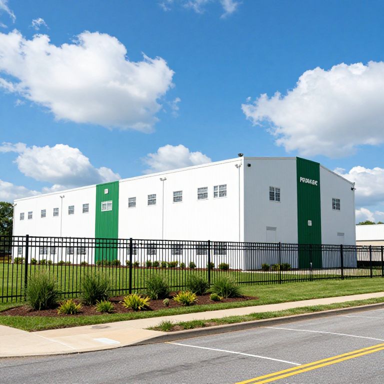 Modern Prime Storage facility in Baltimore, Maryland, featuring a large white building with green accent panels, surrounded by well-maintained landscaped grounds and enclosed by a black metal fence under a bright blue sky with scattered white clouds.