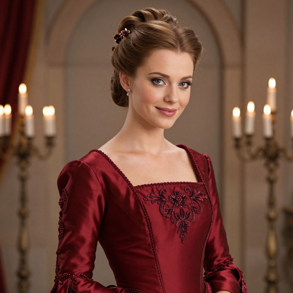 Photorealistic digital portrait of a young woman with fair skin and blue eyes, wearing an elegant, deep red satin dress with intricate black lace embroidery on the bodice and sleeves. Her brown hair is styled in an elaborate updo with a black floral hair accessory. She stands in an opulent, dimly lit room with arched walls and two ornate, candle-lit candelabras in the background. She has a slight smile and wears small, dangling earrings. The warm, ambient lighting highlights the rich textures and colors of her dress and the room's decor.