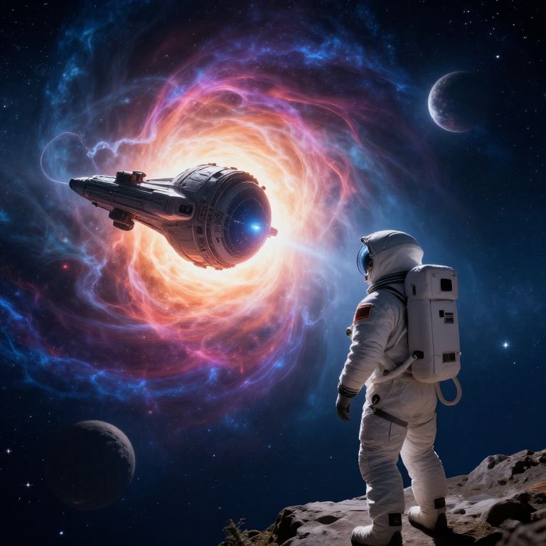 Spaceflight encounter with an alien spacecraft near a mysterious space anomaly, glowing cosmic energy swirling around, astronaut observing cautiously, surreal and imaginative cosmic landscape, vivid colors, blending realism and fantasy elements, high detail