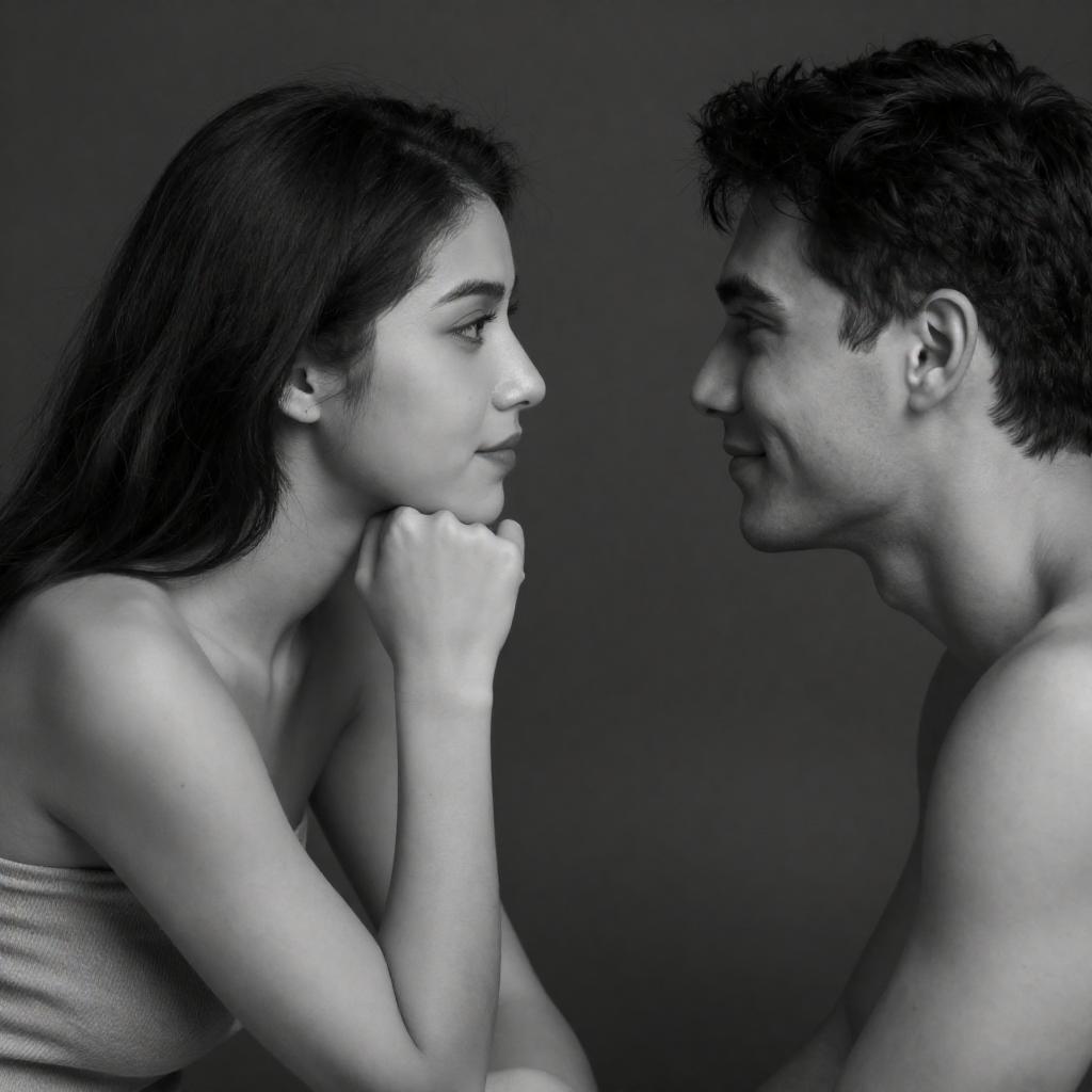Black-and-white photograph of a woman with long dark hair and a strapless top, resting her chin on her hand, gazing intently at a shirtless man with short dark hair. She has a delicate, thoughtful expression, while he looks at her with a slight smile. The background is dark and blurred, emphasizing their intimate connection.