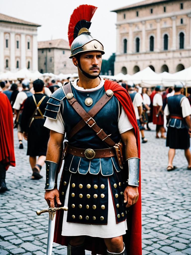 Man in Roman Soldier Costume, cosplay festival photo, photorealistic realism
