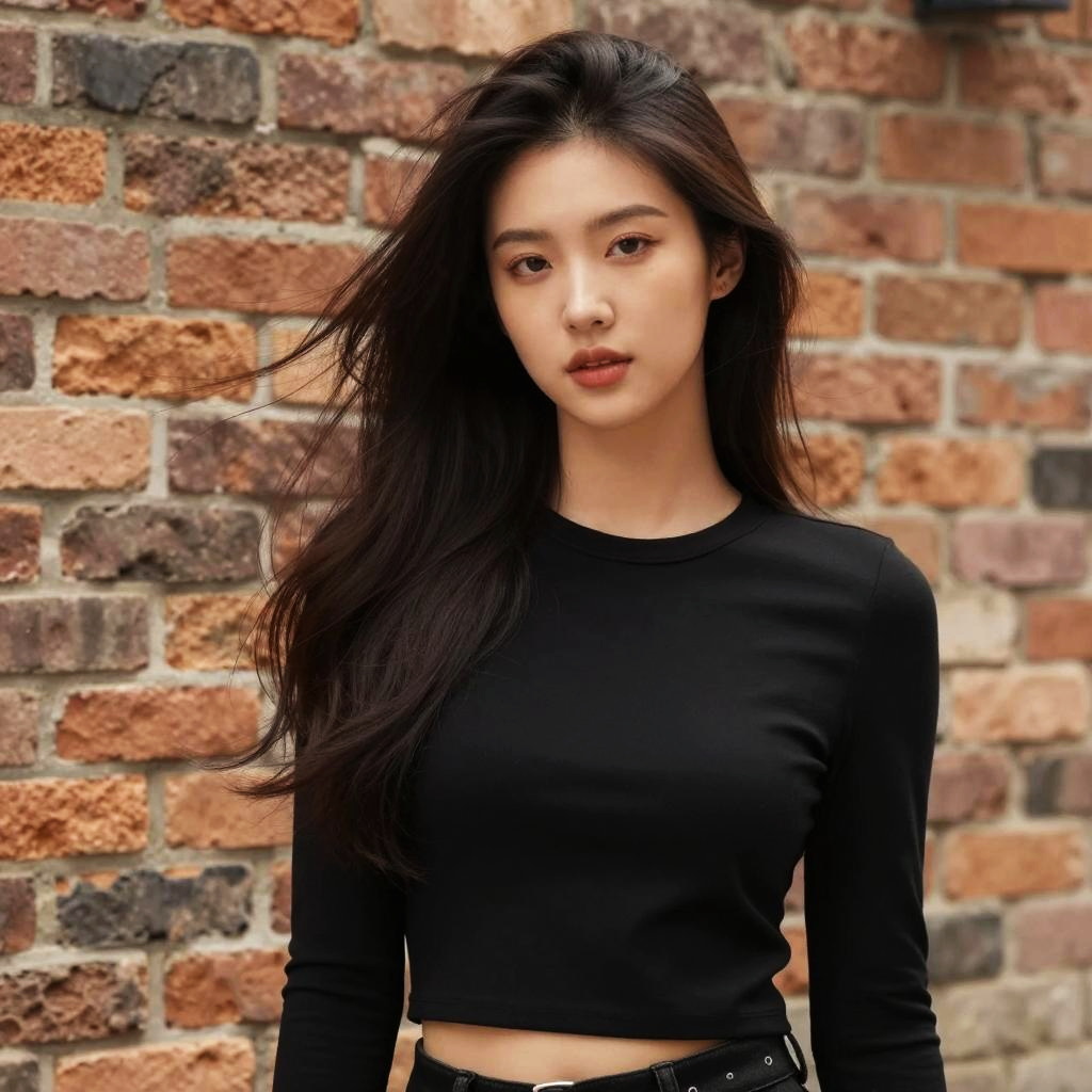 Portrait of a young Asian woman with long flowing dark hair wearing a fitted black crop top. She stands confidently in front of a rustic multi-colored brick wall, showcasing a modern fashion look.