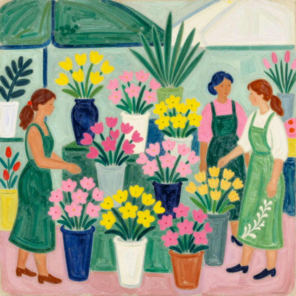 A vibrant flower market, rendered in the style of Henri Matisse, featuring bold outlines and a flattened perspective. The scene captures bouquets, busy florists, with a vibrant, cheerful palette of bright pink, yellow, and emerald green, and decorative patterns inspired by nature, creating a dreamlike and harmonious atmosphere.
